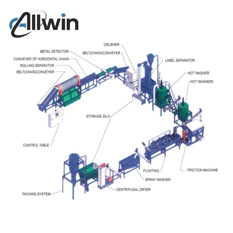 Our PET bottle washing recycling line is used to recycle and reprocess waste plastic PET bottles to clean PET flakes including Cola bottle, Pepsi cola bottle, Mineral water bottle, etc. The advanced washing technology is used to effectively remove dirt, residue and labels from the bottle surface by de-baling,trommel screen,label remover,pre-washer-automatic sorting,crusher,floating wash,hot wash,drying,zigzag separator,eddy current separation,color sorting,etc.